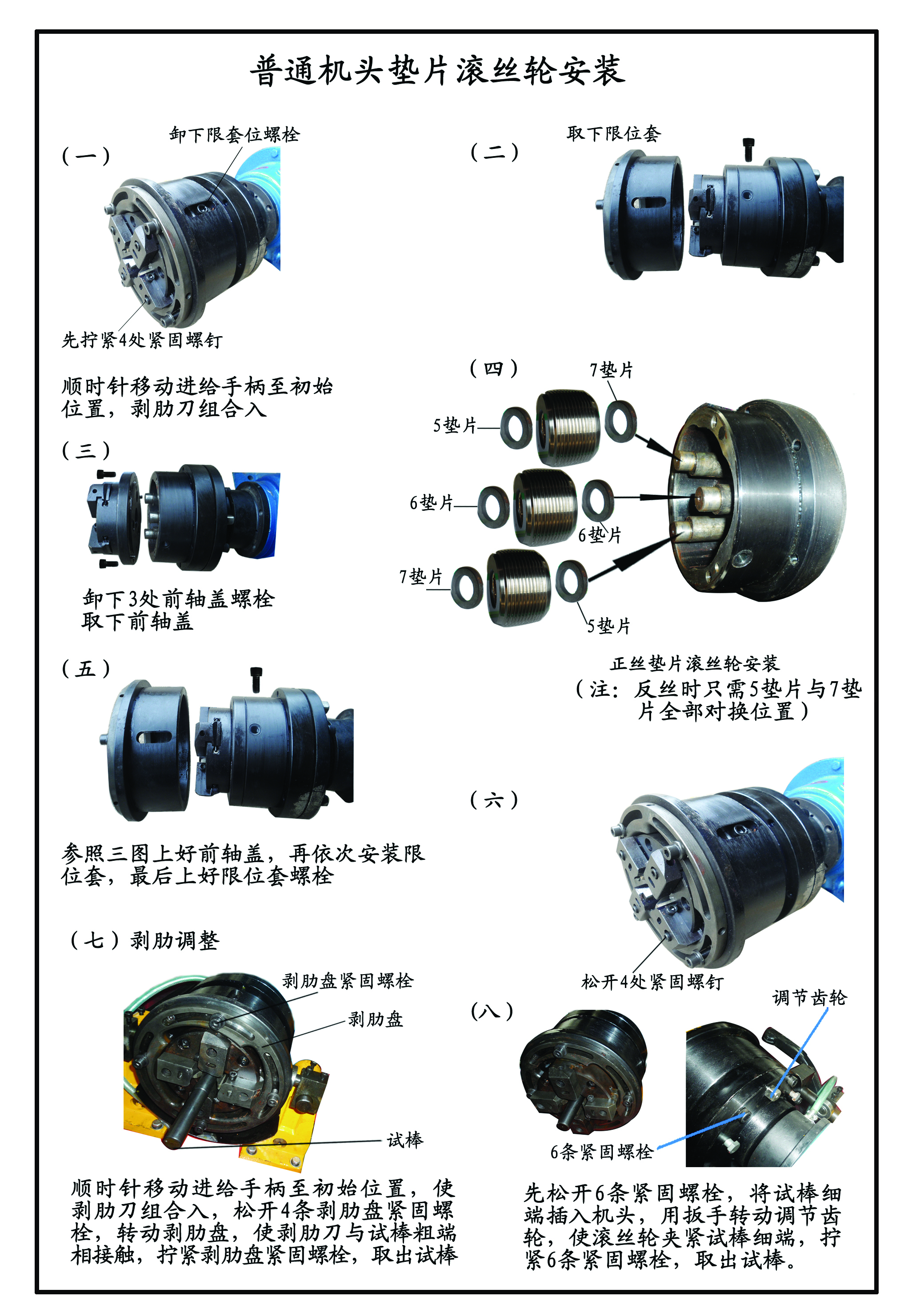 2. 反丝的安装方法:滚丝轮里面的垫片按顺时针为5、6、7,轮外面为7、6、5,里外垫片厚度之和也是12.配电箱内的转向开关扳到反丝位置。